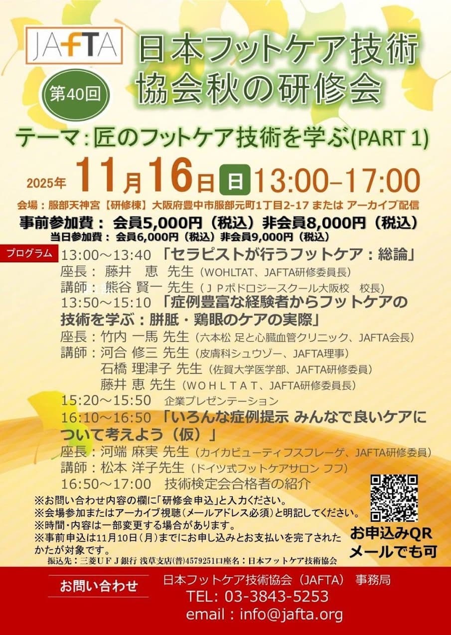 いずれも専門メンバーによる「フットプリント(足裏のコピー)により足や靴のアドバイス」「足の爪やタコ・魚の目などのカウンセリング」などを予定しております(日本フットケア技術協会 秋の研修会は除く)。